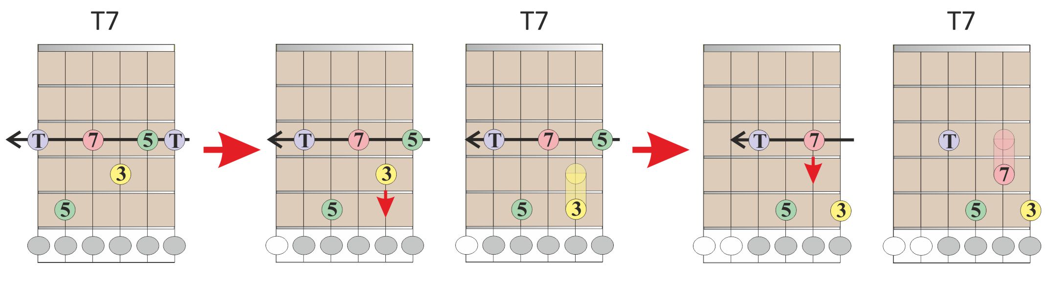 Teremos sempre o mesmo tipo de acorde (T = Maior) com tônicas diferentes, pois mudamos de corda, observe: